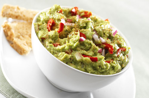 Die Guacamole ganz nach Geschmack abschmecken, z.B. mit durchgepresstem Knoblauch oder feingehacktem Koriander. Gegebenenfalls noch etwas fettarmen Joghurt unter die Avocadocreme rühren.